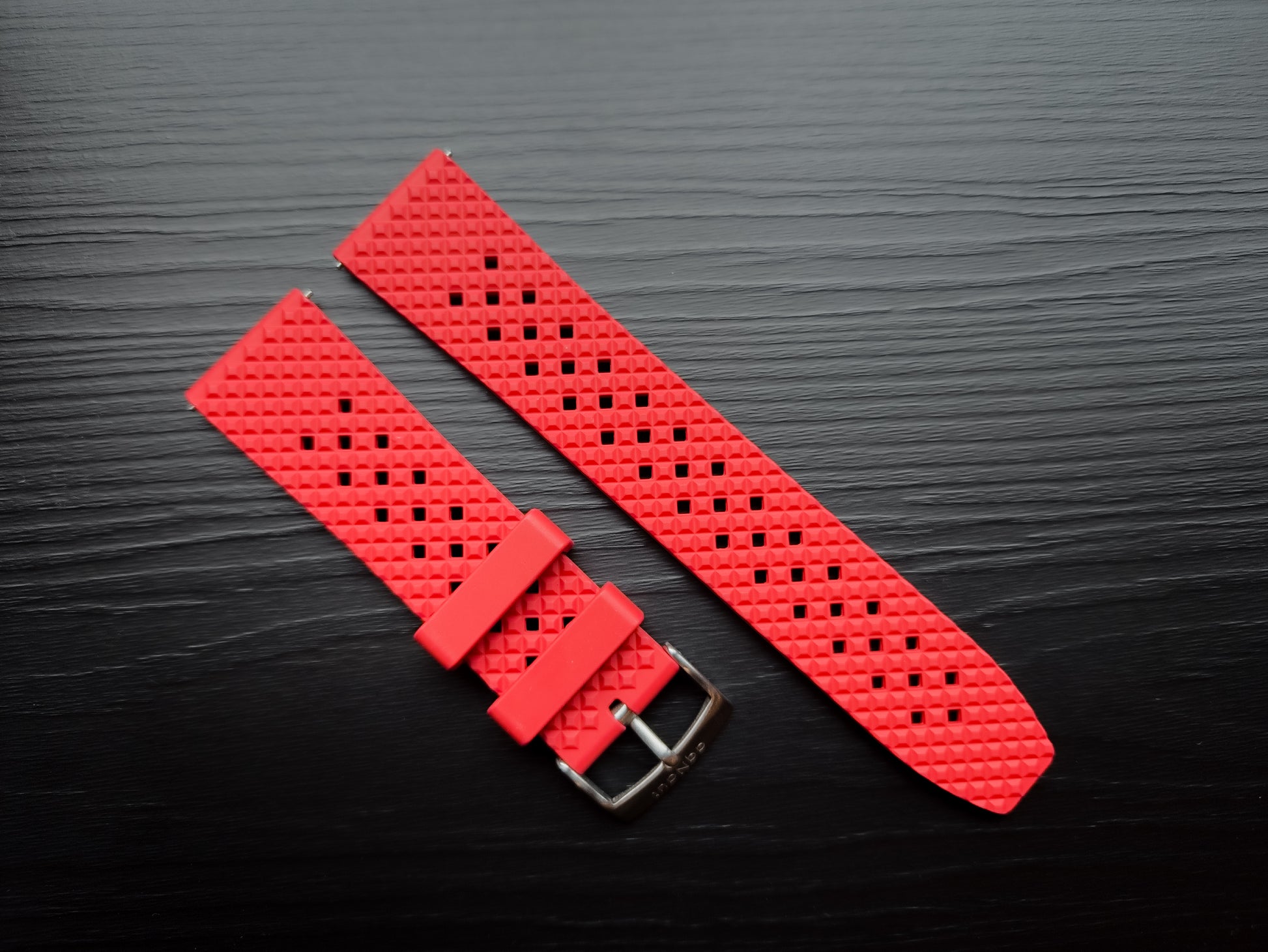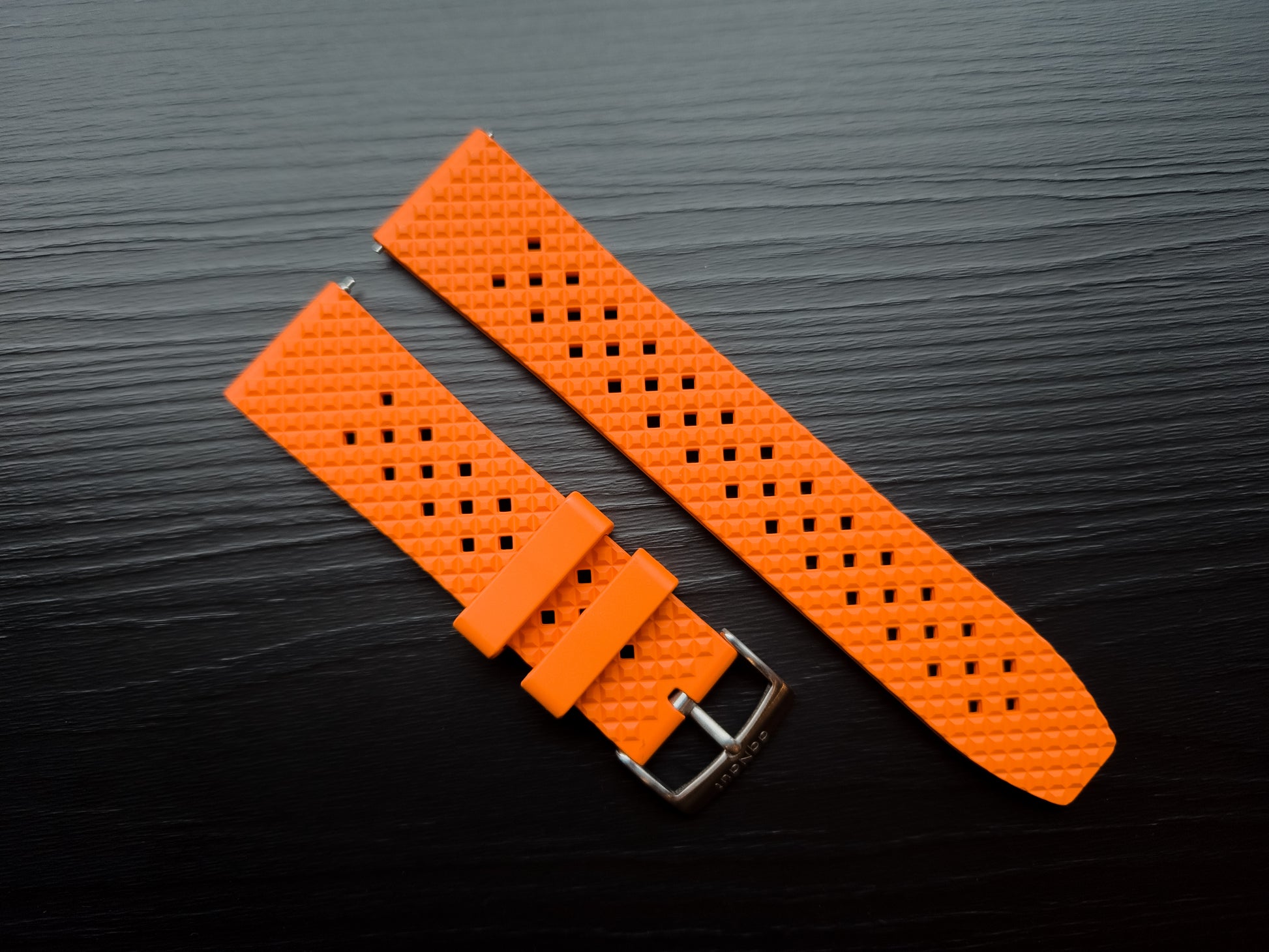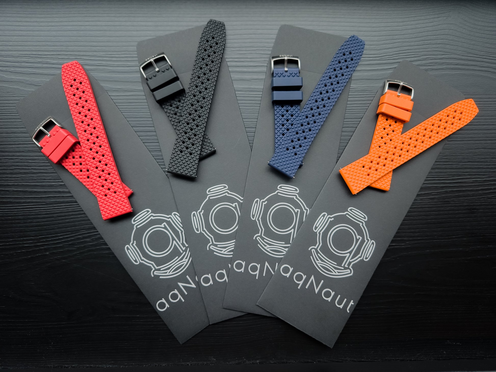 aqNaut Tropical Style Rubber Strap. In 22mm and 20mm widths, available in four vibrant colors: Orange, Red, Blue, and Black.